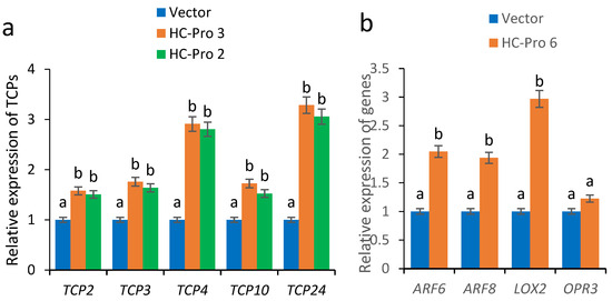 Expression analysis of fertility-related genes in HC-Pro transgenic A. thaliana. (a) RT–qPCR analysis of the expression levels of TCP2, TCP3, TCP4, TCP10 and TCP24 in the transgenic HC-Pro 2 and HC-Pro 3 lines. (b) RT–qPCR analysis of expression levels of LOX2, ARF6, ARF8 and OPR3 in the HC-Pro 6 transgenic line. Vector: expression levels of these genes in the plants transformed with the empty vector, used as controls. The RT–qPCR results were statistically analysed and plotted in Excel and GraphPad Prism 9.5 (two-way ANOVA, p < 0.05); the error bars represent the SEs from three biological replicates. Means identified by different letters are significantly different from each other. The error bars represent the SDs from three biological replicates.