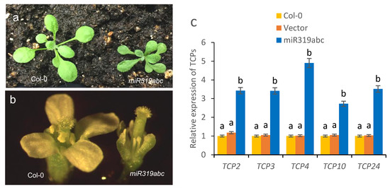 Phenotype of the miR319abc triple mutant and TCP expression analysis. (a) Seedling phenotype of the triple mutants of miR319abc compared with wild-type Col-0 and vector control. (b) Flower phenotype of the miR319 triple mutants compared with the floral organs of the Col-0 control. (c) The expression levels of TCP2, TCP3, TCP4, TCP10 and TCP24 in the miR319abc triple-mutant plants are relative to their expression in Col-0 and vector control plants. The RT–qPCR results were statistically analysed and plotted in Excel and GraphPad Prism 9.5 (two-way ANOVA, p < 0.05); the error bars represent the SEs from three biological replicates. Means identified by different letters are significantly different from each other. The error bars represent the SDs from three biological replicates.