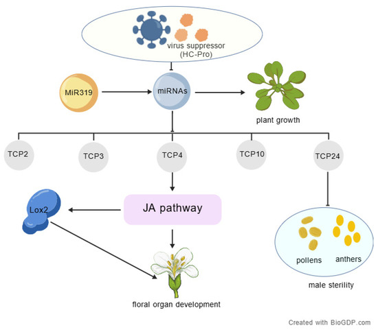 In this study, Agrobacterium-mediated genetic transformation was used to obtain transgenic tobacco and transgenic A. thaliana plants expressing HC-Pro. The results revealed that the miR319-targeted genes TCP2, TCP3, TCP4, TCP10 and TCP24 were significantly upregulated in the transgenic plants expressing HC-Pro. In addition, the expression levels of the fertility-related genes LOX2, ARF6, and ARF8 significantly increased, resulting in the abortion of the transgenic plants. Further studies confirmed that the TCP4 and TCP24 genes play important roles in regulating the elongation of petals and anthers and the release of pollen. This study revealed that HC-Pro likely disrupts miR319–TCP regulatory pathways by interfering with miR319 accumulation, thereby affecting normal floral organ development and contributing to sterility phenotypes (Figure 6).