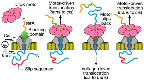 Engineering strategies of natural nanopores. ClpX-assisted thread-and-read strategy: proteins are first electrophoretically transferred through CsgG to the trans side, then pulled back to the cis side by ClpX. Figure 2 from ref. [25], is used under a CC BY 4.0 license (http://creativecommons.org/licenses/by/4.0/ (accessed on 13 October 2025)).