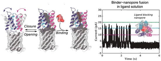 Indirect sensing of proteins and small molecules using nanopores. Ligand-sensing de novo nanopore incorporating a cholic acid binder (CHD_r1). Three helical hairpins of the binder were inserted into different loops of the designed β-barrel. In the absence of ligand, transient interactions lead to current fluctuations, whereas ligand binding stabilizes the interaction and produces prolonged current blockades. Different current levels (0, 10, 15, and 20 pA) are denoted by black, magenta, teal, and green dashed lines, respectively. Figure 4 from ref. [124] is used under a CC BY 4.0 license (http://creativecommons.org/licenses/by/4.0/ (accessed on 13 October 2025)).
