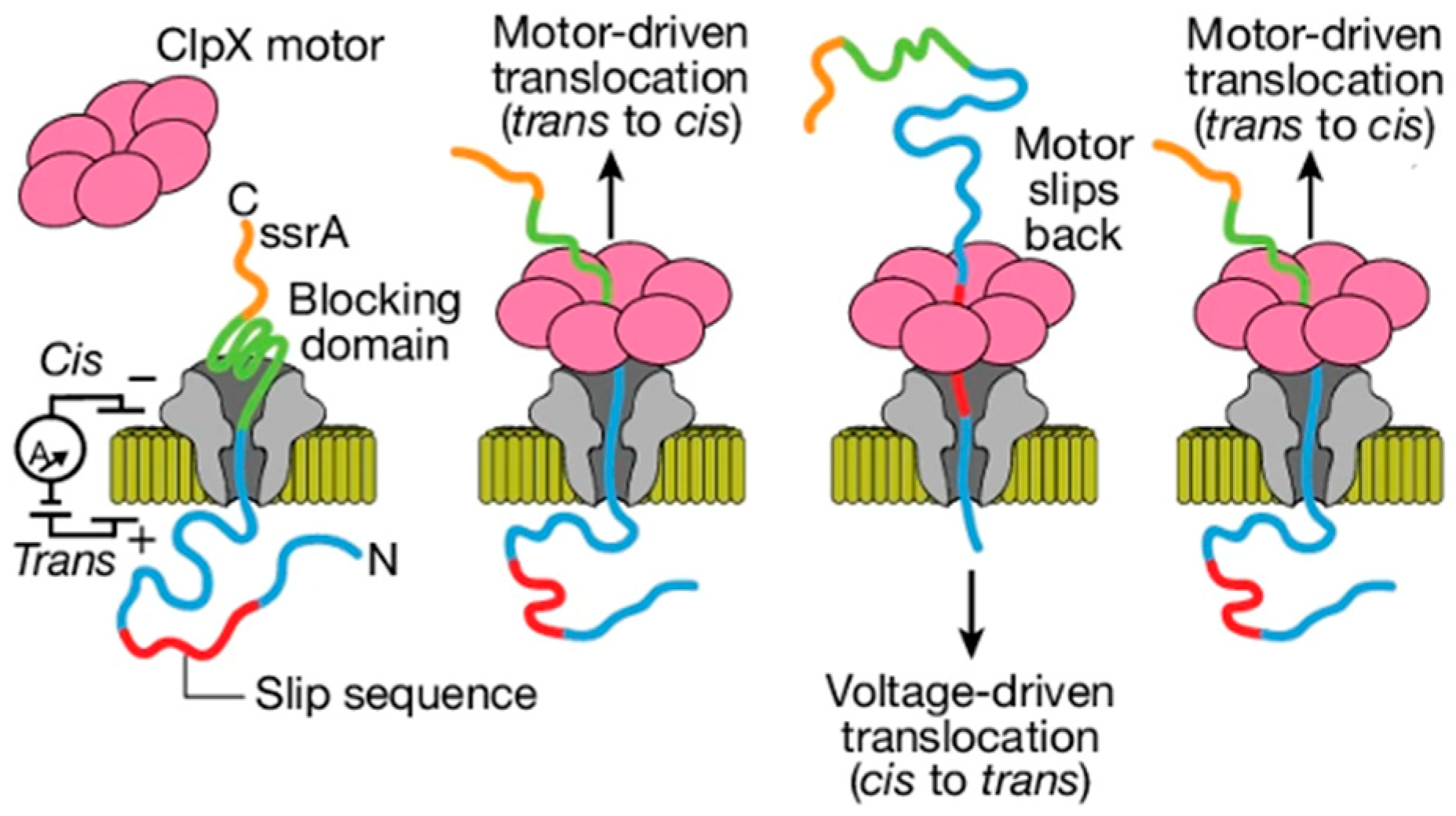 - Nivala, J.; Marks, D.B.; Akeson, M. Unfoldase-mediated protein translocation through an α-hemolysin nanopore. Nat. Biotechnol. 2013, 31, 247–250. [Google Scholar] [CrossRef]