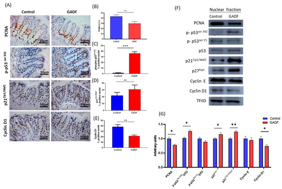 Figure 1. Effects of GADF on cell cycle regulators in the proximal colonic epithelium. (A) Representative immunohistochemical staining of PCNA, p-p53Ser392, p21Cip1/Waf1, and cyclin D1 in control and GADF groups (positive nuclei stained brown); scale bar = 50 µm. Images taken at 200× magnification. Representative fields are shown (BE) Quantification of positive nuclei (%) (n = 10). (F) Western blot analysis of nuclear fractions for PCNA, p-p53Ser392, p-p53Ser15, p27Kip1, p21Cip1/Waf1, and cyclins E and D1 proteins (TFIID as loading control) (unpaired two-tailed Student’s t-test). (G) Densitometric quantification of nuclear proteins expressed as arbitrary units, calculated as the ratio of target band intensity to its corresponding loading control, normalized to the control mean (n = 3) (Mann–Whitney U test). Data are presented as mean ± SD. Statistical significance vs. control: * p < 0.05; ** p < 0.01; *** p < 0.001).