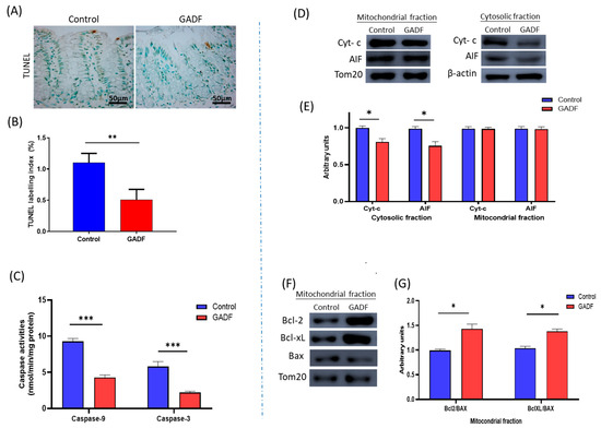 Figure 2. GADF attenuates apoptosis in the proximal colonic mucosa. (A) Representative TUNEL-stained sections (positive nuclei stained brown); Scale bar = 50 µm. Images taken at 200× magnification. Representative fields are shown (B) Quantification of TUNEL-LI (n = 10). (C) Caspase-9 and caspase-3 activities (n = 10) (unpaired two-tailed Student’s t-test). (D) Western blot analysis of cytosolic and mitochondrial fractions showing cytochrome and AIF (β-actin and TOM20 as loading controls). (E) Densitometric quantification of nuclear proteins expressed as arbitrary units, calculated as the ratio of target band intensity to its corresponding loading control, normalized to the control mean (n = 4) (Mann–Whitney U test). (F) Western blot of mitochondrial Bcl-2, Bcl-xL, and Bax. (G) Ratios of Bcl-2/Bax and Bcl-xL/Bax (n = 4). Data are mean ± SD. Statistical significance vs. control: * p < 0.01; ** p < 0.001; *** p < 0.0001.