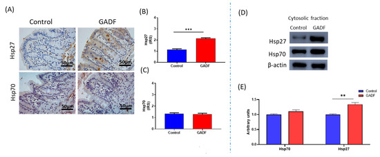 Figure 3. Induction of Hsp27 by GADF. (A) Representative immunohistochemical staining of Hsp27 and Hsp70 in colonic sections from control and GADF-fed rats (cytoplasmic brown color); scale bar = 50 µm. Images taken at 200× magnification. Representative fields are shown (B,C) Quantification of IRS for Hsp27 and Hsp70 (n = 10). (D) Western blot analysis of cytosolic fractions for Hsp27 and Hsp70, with β-actin as loading control. (E) Densitometric quantification of nuclear proteins expressed as arbitrary units, calculated as the ratio of target band intensity to its corresponding loading control (β-actin), normalized to the control mean (n = 4) (Mann–Whitney U test). Data are presented as mean ± SD. Statistical significance vs. control: ** p < 0.001; *** p < 0.0001.