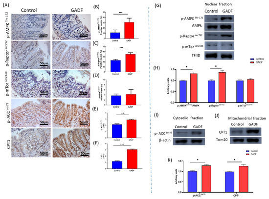 Since AMPK signaling is a central regulator of energy balance and barrier integrity, we next investigated the impact of GADF on the AMPK–mTOR pathway and the downstream ACC1–CPT1 axis in the proximal colon (Figure 4). GADF activated AMPK signaling in the proximal colonic mucosa. Nuclear phosphorylation of p-AMPKThr172 (+29.8% by IHC, +40% by WB) and p-RaptorSer792 (+51.1% by IHC, +38.9% by WB), was markedly increased, while phosphorylation of mTORSer2448, remained unchanged. In parallel, downstream activation of p-ACCSer79 (+34.5% by IHC, +23.3% by WB) and increased levels of CPT1 (+162% by IHC, +30% by WB) indicated a metabolic shift toward fatty acid β-oxidation. These findings indicated that GADF activated AMPK via Raptor in nuclear compartment and promoted a metabolic shift from lipid synthesis toward fatty acid β-oxidation through the ACC1–CPT1 axis.