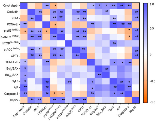 Figure 5. Correlation between epithelial morphology, barrier proteins, proliferative/cell-cycle markers, apoptotic markers, Hsp27, and metabolic signaling. Heatmap of Spearman’s correlation coefficients. The color scale indicates direction and strength (blue, positive; orange, negative; −1 to +1). Asterisks denote statistical significance (* p < 0.05; ** p < 0.01).