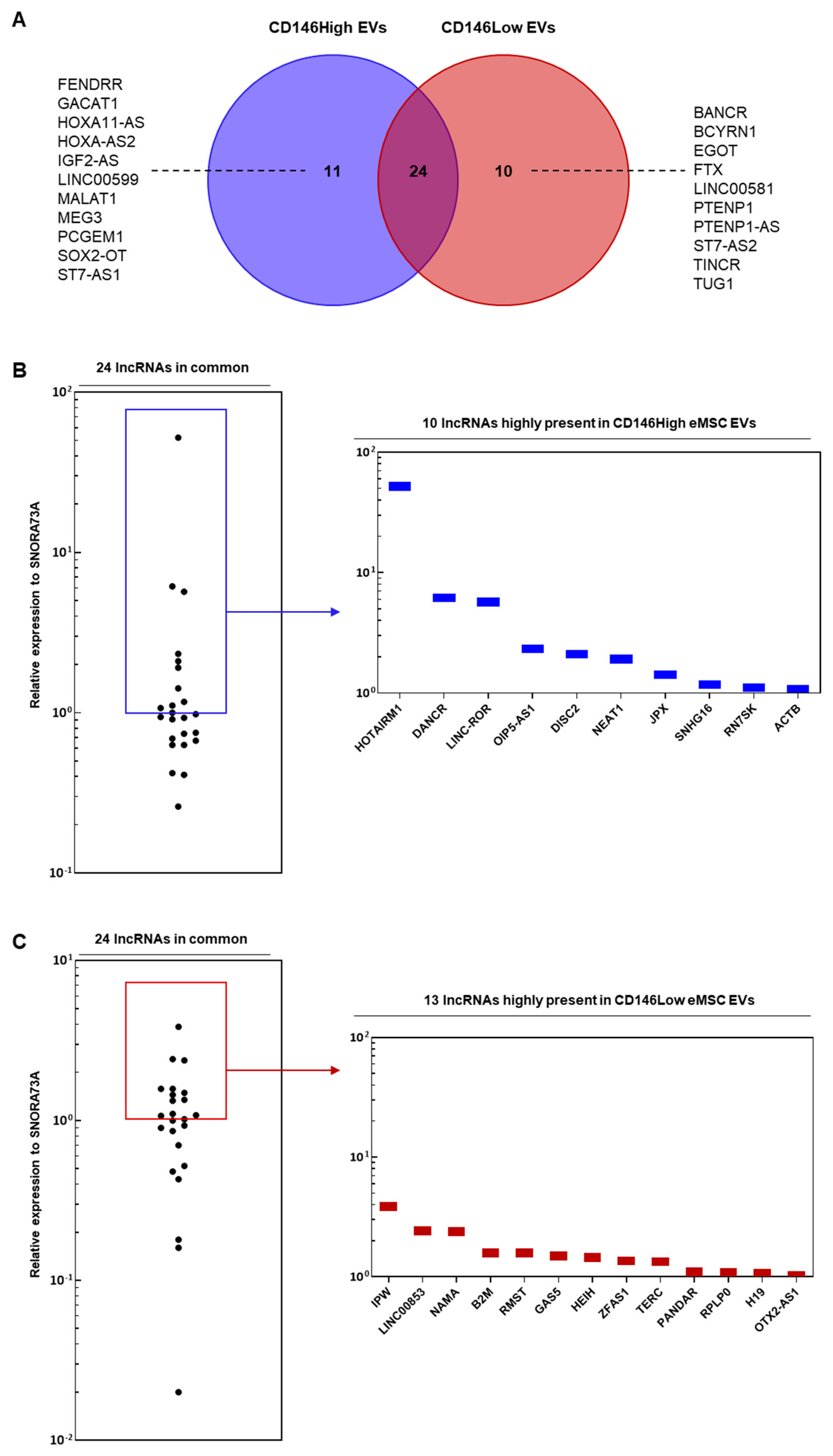 2.2. CD146High and CD146Low eMSC-EVs Possess Immunomodulatory/Angiogenic lncRNA Cargo