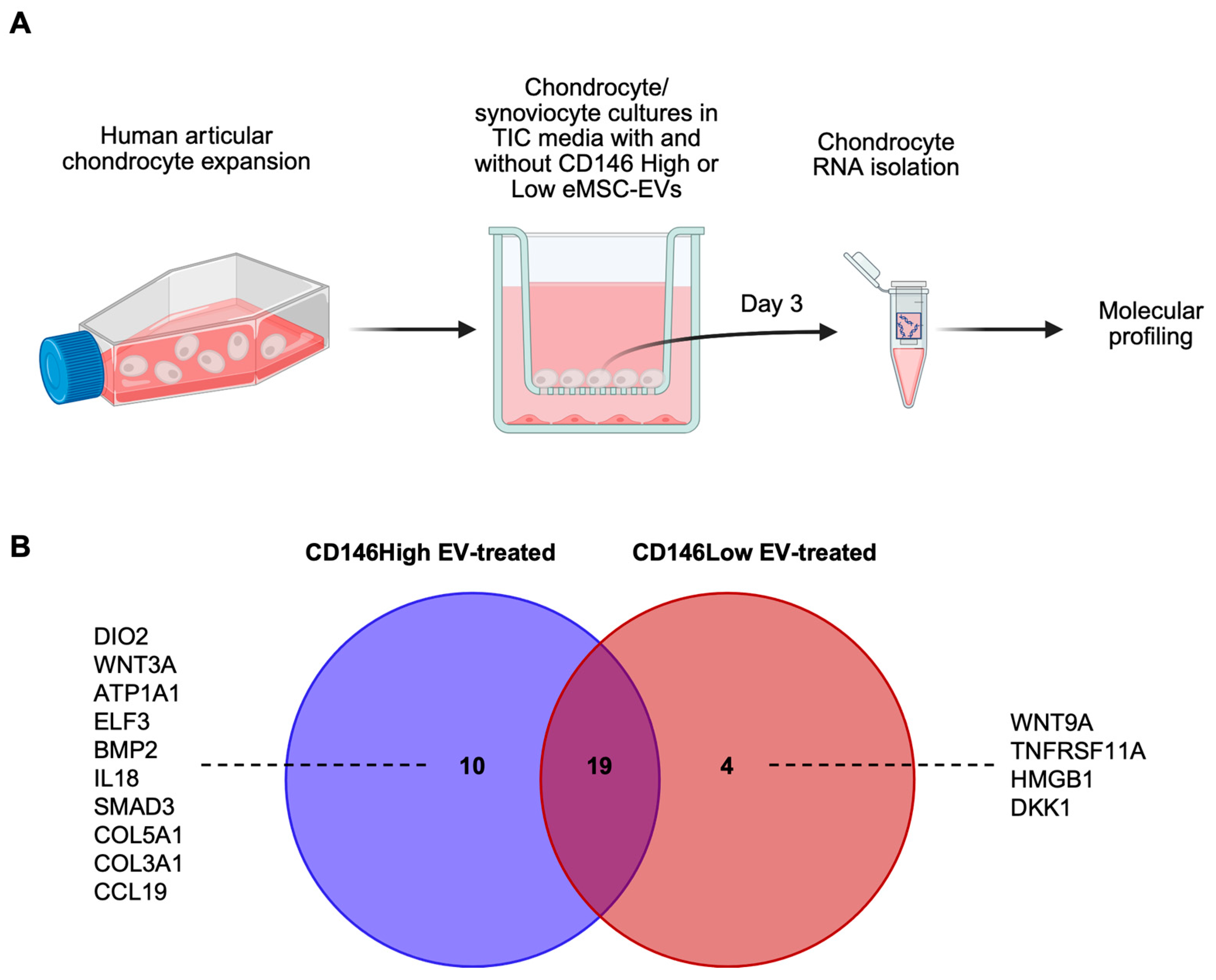 2.3. Molecular Profile of Chondrocytes Exposed to CD146High or CD146Low eMSC-EVs Under Inflammatory Conditions In Vitro