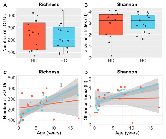 Alpha diversity indices were not significantly different between HD and HC children (richness: mean difference −15.0 [95% confidence interval: −97.32–67.38], p = 0.71; Shannon–Weaver: mean difference −0.16 [−0.57–0.90], p = 0.65) (Figure 1A,B). Alpha diversity increased with age across our HC cohort (richness: r = 0.79, p < 0.004; Shannon–Weaver: r = 0.69, p < 0.004) but not in HD (richness: r = 0.19, p = 0.51; Shannon–Weaver: r = 0.03, p = 0.91) (richness: Fisher’s z = 2.21, p = 0.03; Shannon–Weaver: Fisher’s z = 2.05, p = 0.04) (Figure 1C,D). Alpha diversity was not significantly associated with gender (richness: r = 0.89; Shannon–Weaver: p = 0.57), recent antibiotics (r = 0.03, p = 0.9) or PedsQL symptom scores (richness: r = −0.29, p = 0.42; Shannon–Weaver: r = −0.26, p = 0.48).
