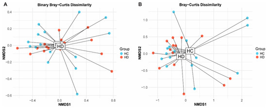 Beta diversity in stool in Hirschsprung’s disease (HD) and healthy controls (HCs). Nonmetric multidimensional scaling (NMDS) plots depict (A) Binary Bray–Curtis dissimilarity and (B) Bray–Curtis dissimilarity. Children with HD (red) did not differ significantly from HCs (blue) in either measure of beta diversity, as indicated by the comparable diagnostic clusters generated by NMDS plots in (A,B).