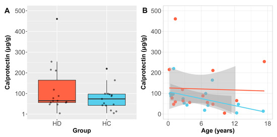 Two HCs and four children with HD had clinically elevated faecal calprotectin (>160 μg/g) as per the specified clinical thresholds (p = 0.65). Children with HD did not differ from HCs in calprotectin levels overall (Wilcoxon rank-sum test, W = 129, p = 0.068) (Wilcoxon rank-sum test, W = 129, p = 0.07) (Figure 3A). Given that children under 4 have higher and more variable levels of faecal calprotectin [18], we also compared levels in children under 4 and over 4 separately but found no diagnostic difference in either age group (under 4 yrs: V = 68, p > 0.99; over 4 yrs: V = 62, p = 0.26). However, higher levels of calprotectin in our cohort were associated with lower levels of alpha diversity even after accounting for age (richness: Spearman’s ρ = −0.39, p = 0.03; Shannon–Weaver: Spearman’s ρ = −0.33, p < 0.04). In analysing putative relationships between GI inflammation and specific members of the microbiota, we found that calprotectin was inversely correlated with abundance of the Oscillibacter genus in HCs (Spearman’s ρ = −0.84, q = 0.03) and positively correlated with abundance of the Fusobacteria phylum in HD (Spearman’s ρ = 0.76, q = 0.02). An inverse relationship between age and calprotectin was observed in controls only (Spearman’s ρ = −0.56, p = 0.035; Figure 3B), and calprotectin was not associated with height or weight in either group (all p > 0.11).