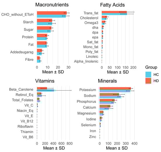 Dietary intake between children with Hirschsprung’s disease (HD) and healthy controls (HCs). Macronutrients are presented as g/1000 kj, fatty acids, vitamins and minerals are presented as mg/1000 kj.