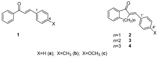 These conformationally constrained cyclic chalcone analogs have a three-dimensional structure not found in conformational equilibrium mixtures of open-chain analogs [24]. Therefore, these compounds—and their analogs with different ring sizes—are useful “molecular tools” for investigating how the size and structure of the ring influence the three-dimensional shape of the chalcone structural unit. Furthermore, various three-dimensional structures result in different degrees of conjugation, which can affect the covalent and noncovalent interactions of the compounds.