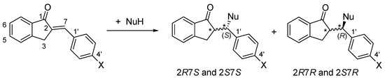 (E)-2-Arylidene-1-indanones (2) are a family of compounds with a wide range of advantageous biological activities [18,19,20,21,22,23]. The mechanism of action of the compounds at the molecular level is not investigated in most of the reported cases. Being α,β-unsaturated ketones, the Michael-type reaction of compounds 2a-c with reactive cellular thiols is one of the possible molecular mechanisms of the biologically active derivatives [12,13,14,15].