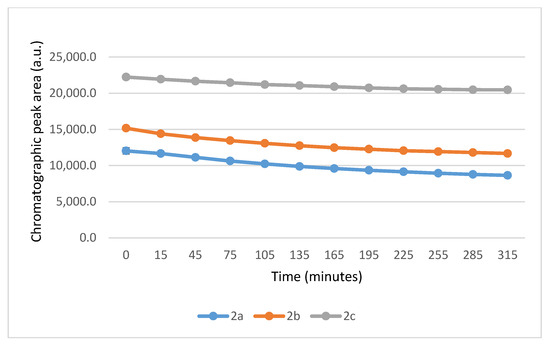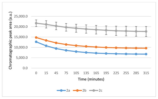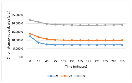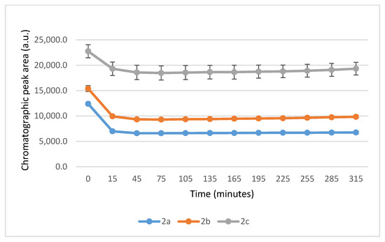 For the determination of the initial (0 min) peak areas of compounds 2a-c, methanolic solutions (4.6 cm3, 2.0 × 10−1 mol L−1) were prepared for each derivative. These solutions were diluted with 1.5 cm3 of the corresponding aqueous buffer (adjusted to the respective pH) prior to analysis. Before mixing, all solutions were preincubated at 37 °C for 15 min.