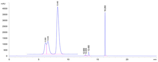 HPLC-UV chromatogram of the 2c/GSH incubate (pH 6.3; 315 min sample). (2c: tr16.26 min, 2c-GSH-1a conjugate: tr12.89 min, 2c-GSH-1b conjugate: tr13.01 min, 2c-GSH-2 conjugate: tr13.48 min.).