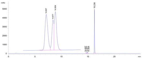 Addition of both thiols results in formation of four diastereomers (Figure 2). Similarly to previous studies [28], the HPLC-UV chromatograms exhibit two distinct groups of peaks. In the case of the GSH adducts, the adducts with shorter retention times (GSH-1) give two partly separated peaks (GSH-1a and GSH-1b), and those with the higher retention times (GSH-2) provide only one asymmetric one (Figure 5, Figures S1 and S2).