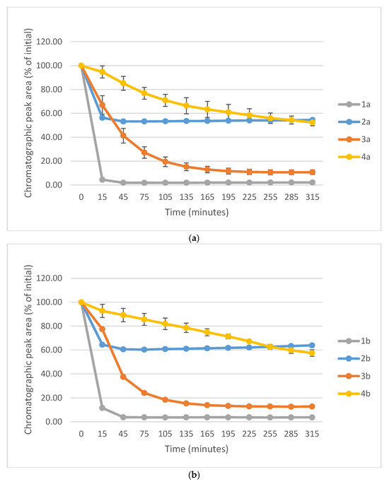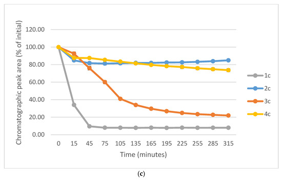 Figure 10a–c show a comparison of the change in HPLC-UV chromatographic peak areas of selected chalcones (1a-c) and their carbocyclic chalcone analogs (2a-c; 3a-c; and 4a-c) as a function of time (min) in the GSH incubations at pH 8.0. As shown, the open-chain chalcones (1a-c) showed the highest reactivity towards GSH. On the other hand, the 2a-c and 4a-c derivatives showed the lowest one. In each series reactivity of the 4′-methoxy-substituted derivative (1c-4c) showed lower reactivity than the respective methyl-substituted ones (1b-4b). Furthermore, the unsubstituted derivatives (1a-4a) showed the highest tiol-reactivity in each series. Similar observations were made while investigating the reactivity of the compounds with NAC under the same conditions (Figure S33). These observations support the theory of Allen and Hamphlett [36], considering the electron-donating capacity of the 4′-aryl substituents as a main driving force of the reverse process.