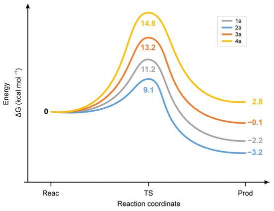 Calculation of the standard ΔG values of the chalcone. CH3S− reactions showed the 2a < 1a < 3a < 4a order for the forward and the 2a < 3a = 1a < 4a for the backward reaction (Figure 12). The unexpectedly low ΔG value of the 2a-CH3S− transition state is likely due to the high increase in conformational freedom accompanied by its formation from the rigid, strongly conjugated (E)-2-benzylidene-1-indanone (2a) [41].