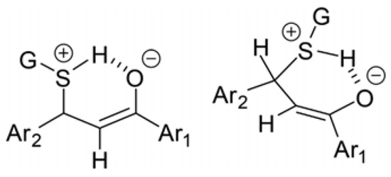 Regardless of the nature of the thiol, the degree of diastereoselectivity of the addition process increases in parallel with the decrease in pH (Table 3 and Table 4). Addition of the neutral thiols to enones results in a zwitterion intermediate. The formed zwitterion can be stabilized by intermolecular hydrogen bonding, resulting in a conformationally preferred six-membered cyclic intermediate [27] (Figure 13).