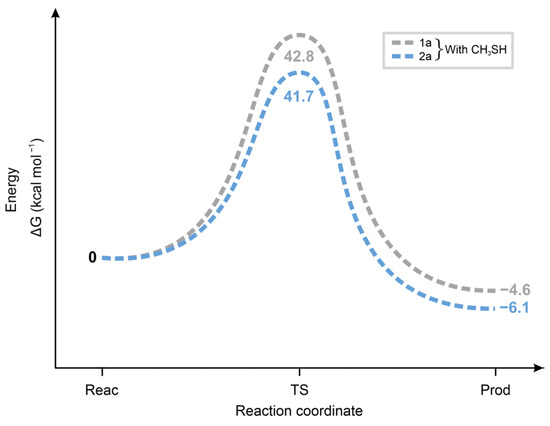Standard free energy change (ΔG, kcal mol−1, y-axis) for the transition state formation (x-axis: Reac = reactants, TS = transition state, Prod = products) of the forward and the backward reactions of 1a and 2a with methanethiol (CH3SH).