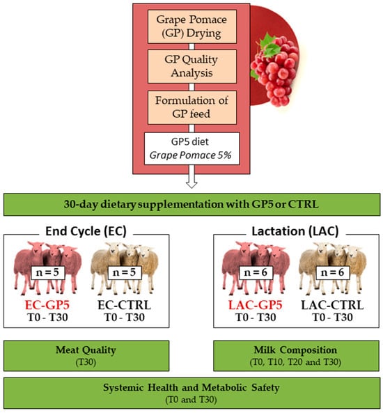 Experimental design. Grape pomace (GP) was dried, analyzed, and incorporated at 5% into the experimental feed (GP5). Thus, the GP5 diet consisted of 95% of the control formulation plus 5% grape pomace. Twenty-two sheep were assigned to two physiological groups: End Cycle (EC, n = 10) and Lactating (LAC, n = 12), each including animals fed either a control or GP5 diet. Lactating ewes were in late lactation (~5 months postpartum) with an average milk yield of ~0.5 L/day. Animals were monitored from day 0 (T0) to 30 (T30). Systemic health and metabolic safety were assessed in both groups (T0 and T30); meat quality was evaluated in EC animals at slaughter (T30), whereas milk composition was analyzed in the LAC group (T0, T10, T20 and T30).