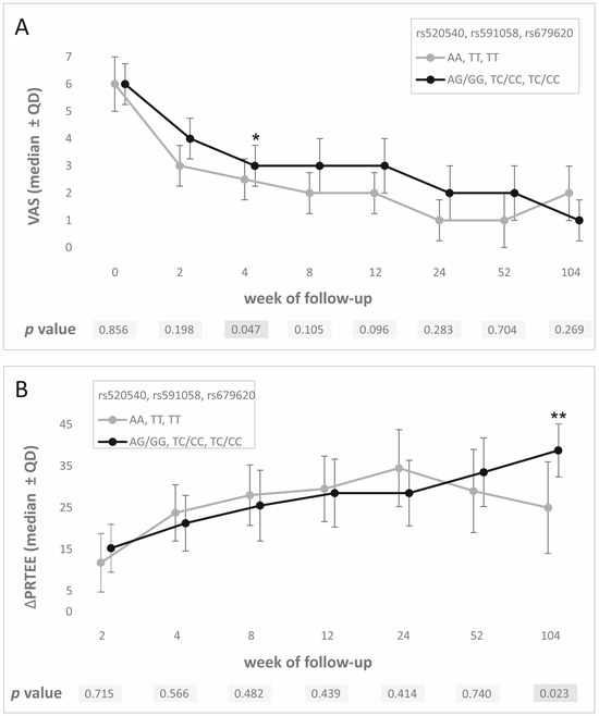 PROM analysis results—medians ± QD at specific follow-up weeks for all polymorphisms studied for (A) VAS, (B) ΔPRTEE. Legend: VAS, visual analogue scale; PRTEE, patient-rated tennis elbow evaluation; QD, quartile deviation; *, statistically significant results; **, statistically significant results after Hochberg correction.