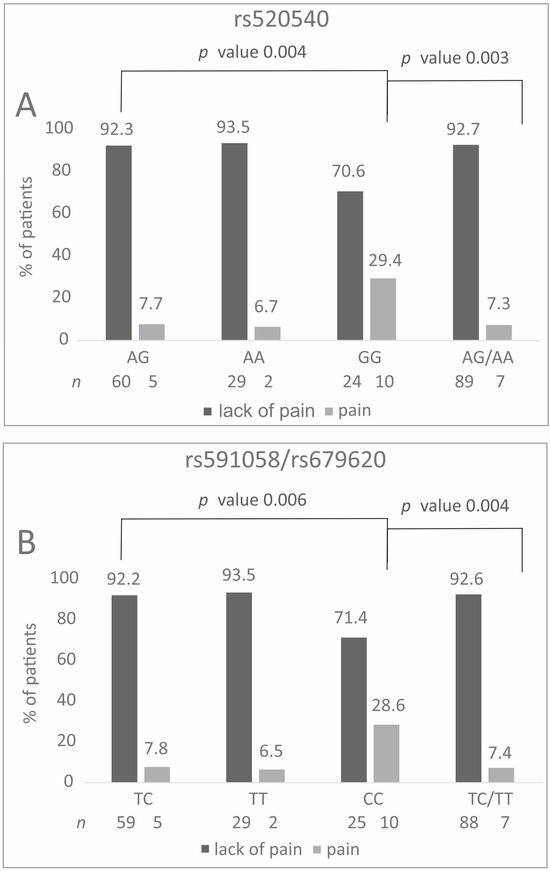 Percentage distribution of specific genotypes carriers in relation to the experience of hand pain before therapy. Results for (A) rs520540, (B) rs591058 and rs679620.