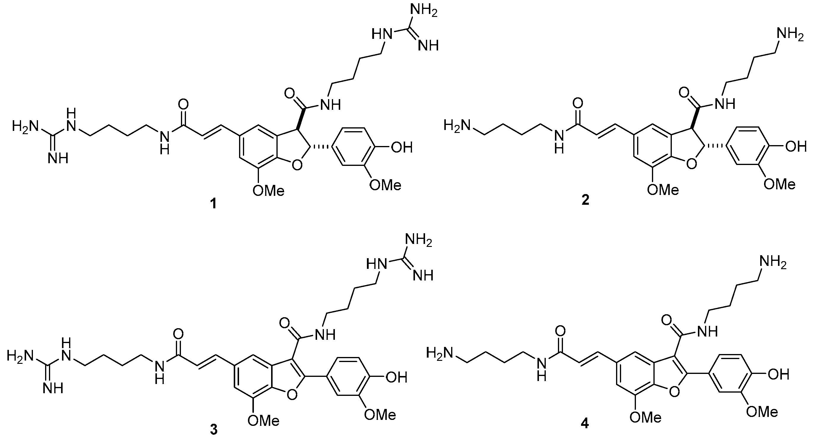 General Procedure for the Synthesis of (2R,3R)-N-(4-Aminobutyl)-5-((E)-3-((4-aminobutyl)amino)-3-oxoprop-1-en-1-yl)-2-(4-hydroxy-3-methoxyphenyl)-7-methoxy-2,3-dihydrobenzofuran-3-carboxamide (2) and (E)-N-(4-Aminobutyl)-5-(3-((4-aminobutyl)amino)-3-oxoprop-1-en-1-yl)-2-(4-hydroxy-3-methoxyphenyl)-7-methoxybenzofuran-3-carboxamide (4)
