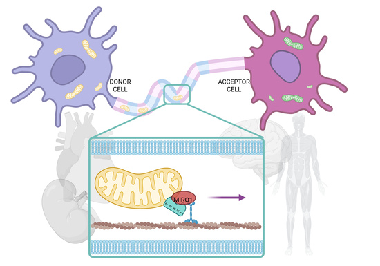 - Ahmad, T.; Mukherjee, S.; Pattnaik, B.; Kumar, M.; Singh, S.; Kumar, M.; Singh, S.; Rehman, R.; Tiwari, B.K.; A Jha, K.; et al. Miro1 regulates intercellular mitochondrial transport & enhances mesenchymal stem cell rescue efficacy. EMBO J. 2014, 33, 994–1010. [Google Scholar] [CrossRef] [PubMed]