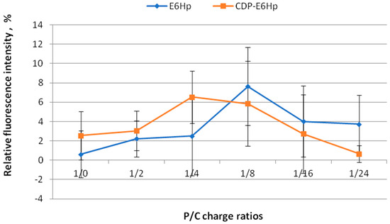 The relative fluorescence intensity of SybrGreen when binding to siRNA at different Phosphate/Carboxyl (P/C) charge ratios of siRNA/R6p complexes (siRNA/R6p ratio of 1/16) and anionic coating—E6Hp (blue) or CDP-E6Hp (orange). Values are the mean ± SD of n = 9 individual samples from three independent experiments.
