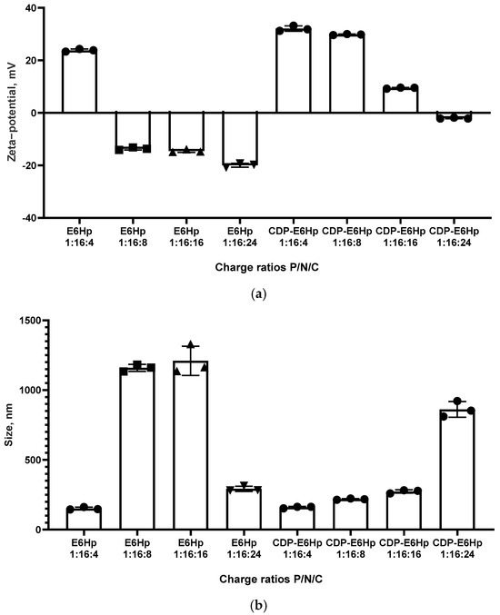 Previously, we demonstrated that siRNA/R6p polyplexes at a P/N ratio of 1:16 exhibited a strong positive charge, with a zeta potential of 33.2 mV, due to the cationic nature of the R6p carrier [48]. In this study, an anionic coating was added to neutralize the positive charge. According to the data presented in Figure 2a, a clear difference is observed between the zeta-potentials of E6Hp-coated and CDP-E6Hp-coated complexes of siRNA with the cationic R6p carrier at low P/N/C ratios (1:16:4). The addition of E6Hp coating only slightly neutralizes the positive charge of the siRNA/R6p polyplex at this ratio, resulting in a zeta potential value of 24.3 mV. However, the addition of CDP-E6Hp at this same charge ratio did not lead to a decrease in zeta potential.