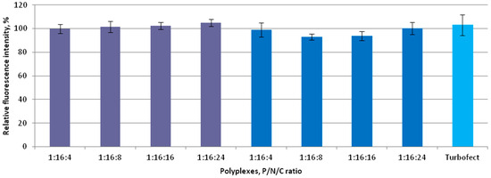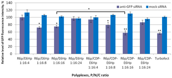 Transfection efficiency of the developed polyplexes was determined by gene silencing in GFP-expressing MDA-MB-231 cells by applying specific siRNA. Level of GFP fluorescence was assessed by spectrofluorimetry and the level in intact cells was taken as 100% for comparison (Figure 4). Specificity of RNA-based gene expression silencing was confirmed by using mock siRNA as a negative control, whereas siRNA/Turbofect complexes were used as a positive control. Additionally, representative images of GFP-expressing MDA-MB-231 cells were recorded using fluorescent microscopy after RNAi-mediated gene expression silencing (Figure S1).