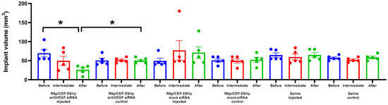 Volume of endometriotic implants in rats measured before and after the treatment with the anti-VEGFA or mock siRNA/R6p/CDP-E6Hp polyplexes. *—p < 0.05 when compared with animal before treatment and treated with mock siRNA. The data are shown as the mean ± S.E.M. of n = 5 individual samples; statistical significance was assessed by Kruskal–Wallis test with Dunn’s correction.