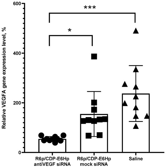 In vivo silencing of VEGFA gene expression in endometrial implants following administration of anti-VEGFA or control siRNA/R6p/CDP-E6Hp polyplexes. Expression levels are presented relative to those observed in untreated implants. *—p < 0.05 when compared with mock siRNA-polyplexes; ***—p < 0.001 when compared with saline. The data are shown as the mean ± S.D. of n = 5 animals per experimental group and two independent measurements per animal; statistical significance was assessed by ordinary one-way ANOVA.