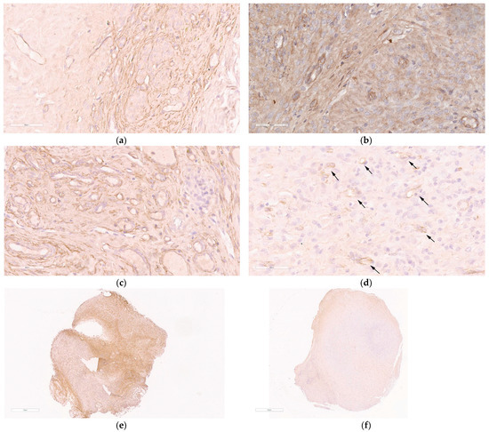 The immunohistochemical analysis of CD34-immunostained paraffin-embedded sections of endometriotic implants: (a) intact contralateral implant; (b) implant after the treatment with the mock siRNA/R6p/CDP-E6Hp polyplexes; (c) implant after injection of saline; (d) implant after the treatment with the anti-VEGFA siRNA/R6p/CDP-E6Hp polyplexes, arrows indicate areas of VEGFA expression (magnification 400×, bar represents 60 µm); (e) full-size image of intact contralateral implant; (f) full-size image of implant treated with the anti-VEGFA siRNA/R6p/CDP-E6Hp polyplexes (magnification 40×, bar represents 1 mm).