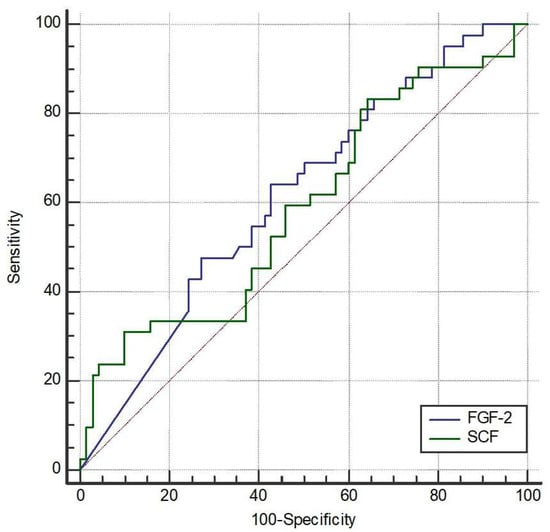 Receiver operating characteristic (ROC) curves of fibroblast growth Factor-2 (FGF-2) and stem cell factor (SCF) to discriminate the occurrence of acute exacerbation (AE). The area under the curve (AUC) for FGF-2 was 61.4% (95% CI 51.8–70.5%, p = 0.032). The optimal cutoff point for FGF-2 was determined to be 9.12 pg/mL, providing a sensitivity of 64.3% (95% CI 48.0–78.4%) and a specificity of 57.1% (95% CI 44.7–68.9%). The AUC for SCF was 58.9% (95% CI 49.2–68.1%, p = 0.117), and an optimal cutoff point was not determined due to lack of statistical significance.