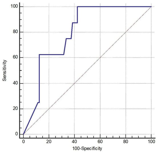 The AUC of NGF was 79.7% (95% CI 71.1% to 86.8%, p < 0.001) (Figure 2). The optimal cutoff of NGF was 25.23 pg/mL with a sensitivity of 100% (95% CI 63.1% to 100%) and a specificity of 57.7% (95% CI 47.6% to 67.3%).