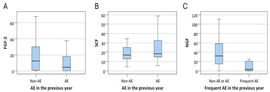 The level of FGF-2 (A) and SCF (B) of patients with and without acute exacerbation (AE), and NGF (C) levels of patients with and without frequent AE. The center line within the box represents the median, while the lower and upper edges of the box indicate the 25th and 75th percentiles, respectively.