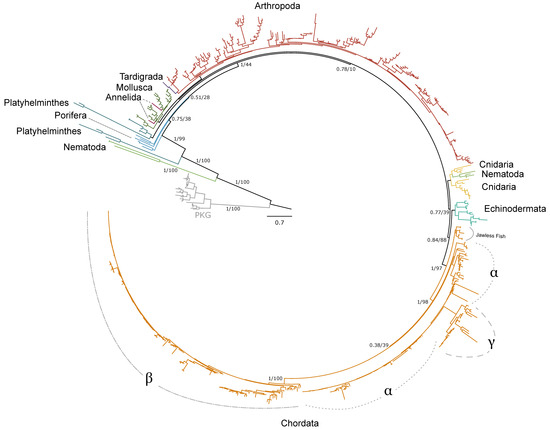 Phylogenetic relationships of the catalytic subunits of cAMP-dependent protein kinase among Metazoans. Tree is rooted by the PKG outgroup and was inferred using the JTT+I+G4 substitution model as identified by ModelFinder [41]. Branch support for outer branches is indicated by UltraFast bootstrap support as well as an approximate Bayes test (UFboot/aBayes). Within Chordata, the catalytic subunit isoform is denoted for α, β, and γ, as well as PKA-C homologs identified in jawless fishes, as characterized by Søberg and colleagues [40]. Line color by phyla is as follows: Porifera, light blue; Cnidaria, yellow; Platyhelminthes, dark blue; Mollusca, dark green; Annelida, maroon; Nematoda, light green; Arthropoda, red; Tardigrada, purple; Echinodermata, teal; Chordata, orange.