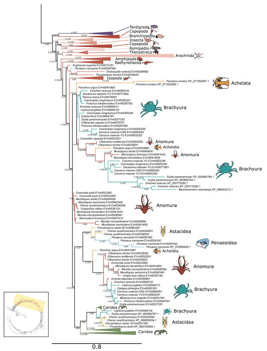 Phylogenetic relationship of PKA catalytic sequences among Arthropoda. Tree is an expanded view of the complete phylogeny presented in Figure 1, as indicated by the region highlighted in yellow in the inset. For visual clarity, orders other than Decapoda are collapsed, as well as caridean shrimp. Branch support is indicated for UFboot/aBayes. Taxa icons are from Phylopic.org; see Supplementary Files for complete references.