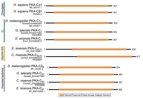Domain organization of PKA catalytic subunits. To-scale schematic representing the length and position of the kinase domain in the catalytic subunit of PKA in humans, fruit flies, and true crabs (G. lateralis, C. maenas, and E. sinensis) when full-length sequences were identified.