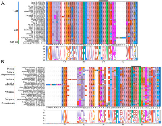 Within the Brachyura, domain organization analyses identified multiple PKA-C isoforms consistent with the domain organization of model organisms, including humans and fruit flies (Figure 3). The sequences that were most similar at the larger-scale domain organization level (Figure 3; C1) also shared the most homology with chordate sequences in the N-terminal sequence upstream of the kinase domain (Figure 4). All major invertebrate phyla possessed PKA-C isoforms that were highly homologous to those characterized in chordates; these were designated PKA-C1, in accordance with established nomenclature in Drosophila (Figure 3 and Figure 4). The N-terminal consensus sequence, where x represents any amino acid, in chordates for all PKA-C isoforms was MGNxxxx[K/R] (Figure 4A). The N-terminal consensus sequence for PKA-C1 in invertebrates was MGNxxxxK, with a few species-specific exceptions (Figure 4B). Multiple sequence alignments (MSAs) of the N-terminal regions also indicated strong conservation of an FxxxW motif in PKA-C among metazoans (Figure 4 and Figure 5).