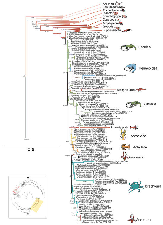 Phylogenetic relationship of PKA-RI sequences among Arthropoda. Tree is an expanded view of the complete phylogeny presented in Figure 6, as indicated by the region highlighted in yellow in the inset. For visual clarity, orders other than Decapoda are collapsed. Branch support is indicated for UFboot/aBayes. Taxa icons are from Phylopic.org; see Supplementary Files for complete references.