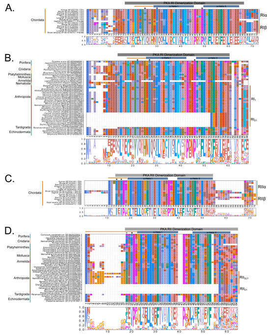 Multiple sequence alignments of the dimerization domain of PKA regulatory subunits in Metazoans. MSA color scheme corresponds to similarities in amino acid physiochemical properties. Full sequences were aligned using MAFFT-DASH; dimerization domains were identified by NCBI-CDS and are indicated with gray bars for each group. A-helices are indicated by blue bars, the motif that distinguishes RI and RII D/D domains (horizontal orange line), and residues that are essential for AKAP binding (asterisk *) were identified based on homology with D/D domains as previously annotated (Peng et al., 2015 [14]; Dahlin et al., 2021 [42]). Select PKA-RI sequences from chordates (A) and invertebrates (B) and select PKA-RII sequences from chordates (C) and invertebrates (D).