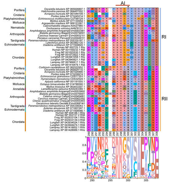 Multiple sequence alignment of the autoinhibitory substrate within PKA regulatory subunits among Metazoans. MSA color scheme corresponds to similarities in amino acid physiochemical properties. The autoinhibitory site (AA positions 297–300) is located between the D/D domain and the kinase domain in PKA regulatory subunits. Subunits are sorted by phyla, as indicated on the left, and type, as indicated on the right (RI, light blue; RII, yellow). RI and RII AI sites are distinguished at residue 300 (in this alignment, as indicated by an asterisk *). The RI motif is RRx[A/G] and the RII motif is RRxS, where x represents any amino acid.