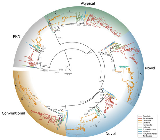 Five distinct PKC protein clades were identified by phylogenetic analyses (Figure 12). These clades corresponded to the five subfamilies found in chordates: PKN, conventional (cPKC), atypical (aPKC), and two novel (nPKC) subfamilies, delta-like and epsilon-like. The PKC tree was rooted from PKG, which diverged earlier than PKCs and shares only the kinase domain, which is highly conserved across AGC kinases [2,17,37]. This phylogeny supports the assertion that PKN is basal to the other PKC subfamilies [17]. With the exception of nPKC delta-like in Platyhelminthes and Tardigrada, at least one sequence from each of the major metazoan phyla was identified in each subfamily. This result is consistent with a previous analysis that included one species each from sponge (Porifera), roundworm (Nematoda), fruit fly (Arthropoda), and sea urchin (Echinodermata), and was rooted from a single yeast PKC1 sequence [17]. The absence of nPKC delta-like sequences in Platyhelminthes and Tardigrada may represent a gene loss but also may be a result of the relatively limited sequence data available for those phyla.