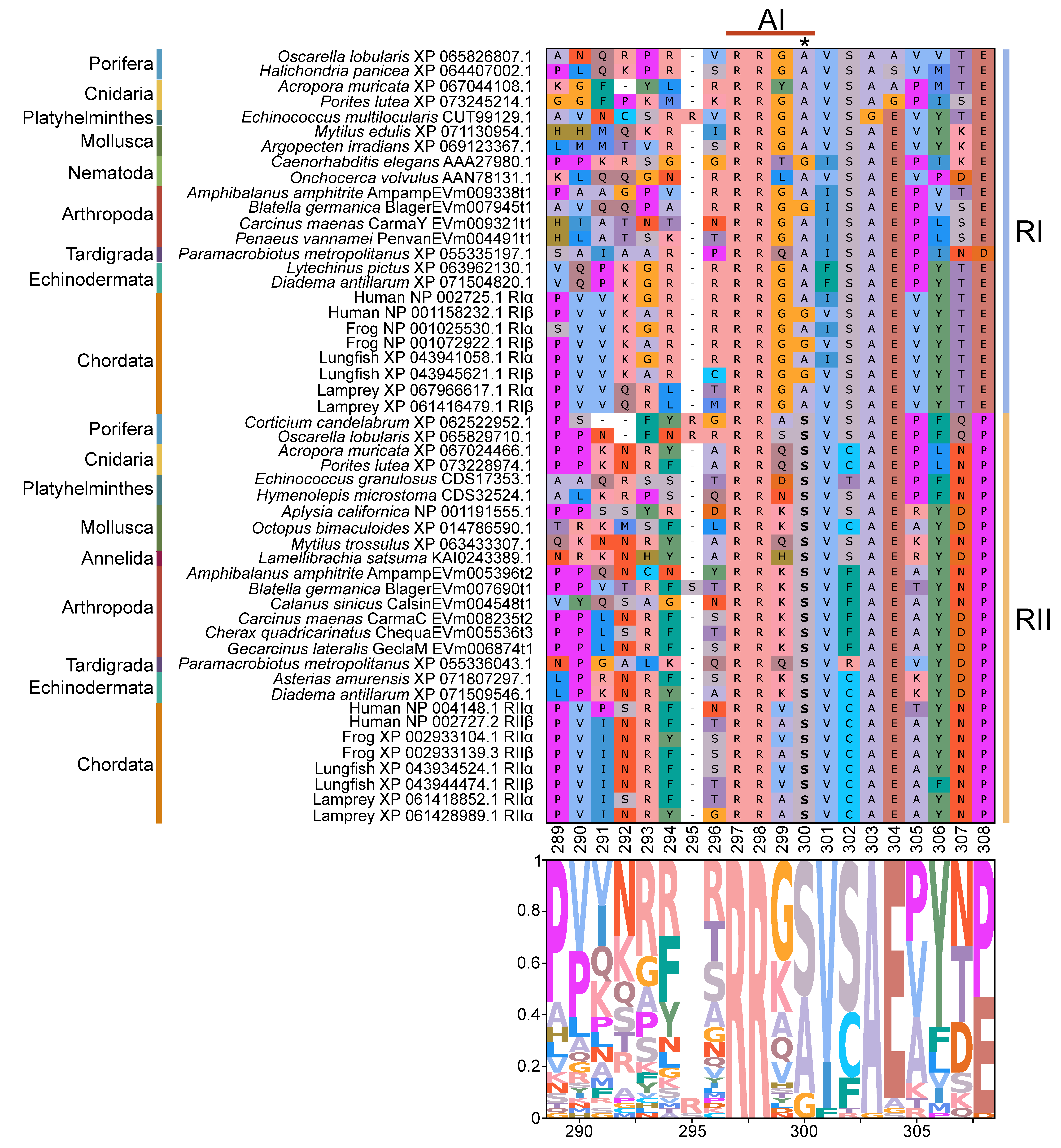 | H. sapiens PKA-RIα NP_002725.1 | H. sapiens PKA-RIβ NP_001158232.1 | D. melanogaster PKA-RIAA DromelEVm005673t1/NP_001189147.1 | C. maenas PKA-RI1 CarmaY_EVm009321t1 | C. maenas PKA-RID1 CarmaY_EVm009321t2 | E. sinensis PKA-RI1 Erisi1_EVm007953t3/XP_050718363.1 | E. sinensis PKA-RID1 Erisi1_EVm007953t2 | G. lateralis PKA-RID1 GeclaM_EVm010036t1 | C. quadricarinatus PKA-RI1 ChequaEVm006131t1 | C. quadricarinatus PKA-RID1 XP_053629376.1 | P. vannamei PKA-RI1 PenvanEVm004491t1/ XP_069981575.1 | P. vannamei PKA-RID1 XP_069981583.1 | ||||