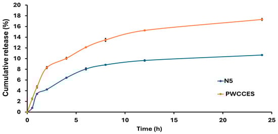 Comparison of Niosome formulation release profiles from niosome-encapsulated PWCC extract (N5) and PWCC extract solution (PWCCES).